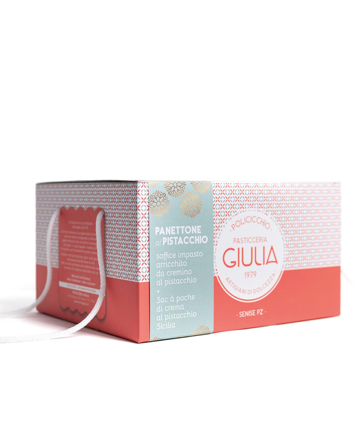 Ingredienti: farina di frumento “00” e “0”, acqua, burro, zucchero, tuorlo d’uovo pastorizzato categoria A, lievito naturale, cioccolato bianco 35%, zucchero, burro di cacao, latte intero in polvere, pasta di pistacchio, granella di pistacchio, miele, burro di cacao, pasta d’arancia (zucchero, glucosio), latte scremato in polvere, sale.